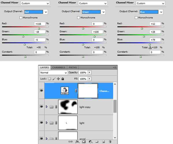 在这一步中,将整体颜色调整, 为了实现这一点,首先,新建调整图层:通道混合器。