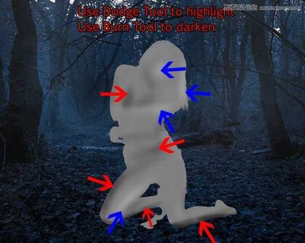选择加深/减淡工具,中间值调整为12%,然后开始涂抹美女,位置如下: 红色为加深,蓝色为减淡。
