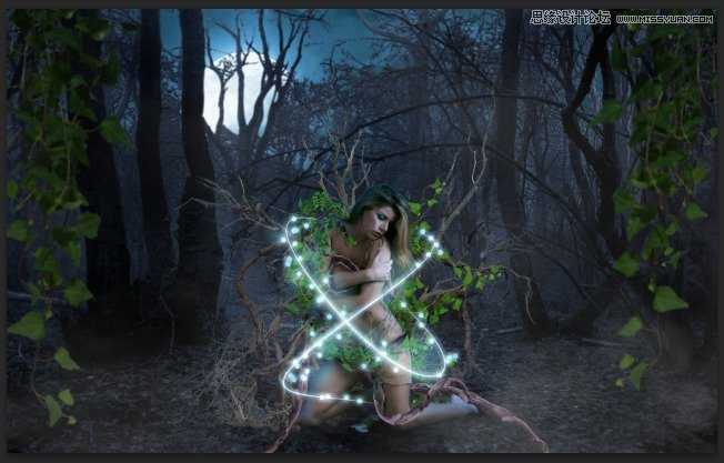 现在置入另一个笔刷——Ray Light brush(资源里的最后一个),选择一个你喜欢的并在月亮的周围描绘出月光。降低其透明度,数值随意,只要你觉得可以。