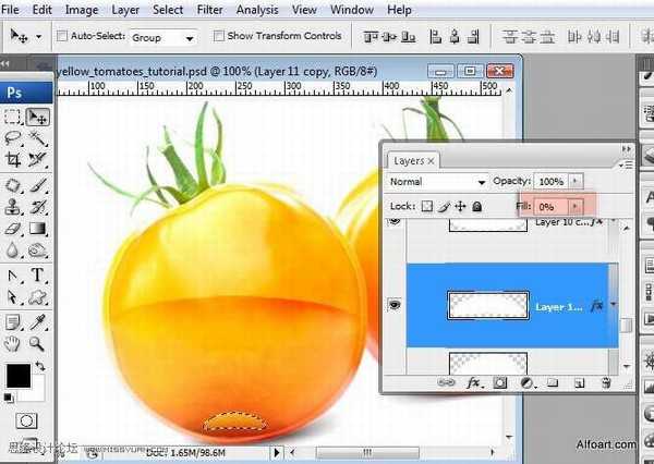 23、对西红柿形状载入选区,填充任何颜色,填充为0。对新建图层添加图层蒙版,对于中部图示位置载入选区,使用黑色画笔,不透明度30%,涂抹选区。