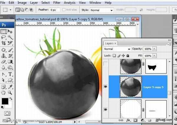 28、为了创建一个西红柿的反射色彩效果,将正常的西红柿上半部粘贴到新的图层,图层混合模式为颜色,使用柔角笔刷擦去底部和边缘。