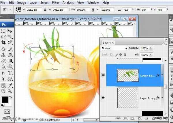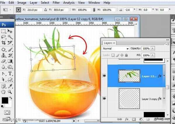 67、将左侧西红柿所有图层复制并合并复制图层,垂直旋转到新建图层,将旋转图层放在复制图层之下。
