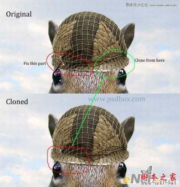 4.打开“头盔”图像,抠选下来,并放在松鼠的头上,为了使头盔的两边对称,我在这里克隆了右侧。
