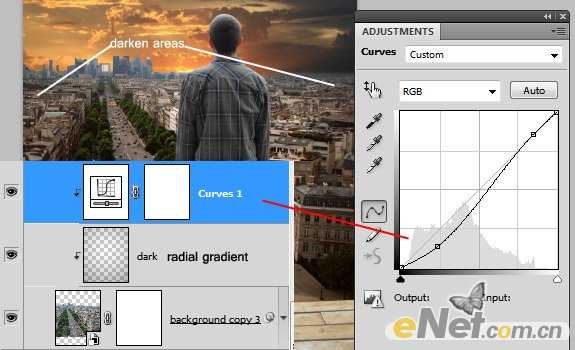 3、制作日落我们还需要让现在的背景颜色匹配,新建一个图层,选择“渐变工具”设置一个从黑到透明的渐变,绘制一个渐变,然后给他“创建剪贴蒙版”。选择“曲线”如下调整,并“创建剪贴蒙版”。