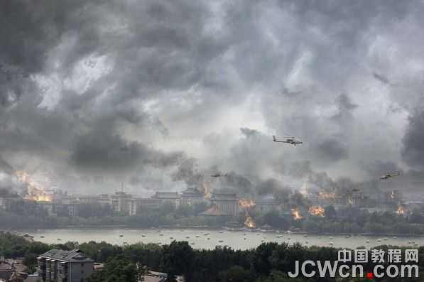 14、在图片上添加一些直升机,增加逼真感。使用素材中直升机图片,拖放到正在处理的图片中。用套索工具勾出直升飞机,并做多个复制层并调整大小,菜单--编辑--变换--水平翻转。看下添加直升机后的效果。