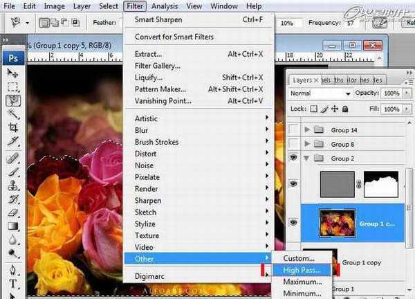 9、在组2的Group 1 copy图层添加效果,打开滤镜>其他>高反差保留。将图层混合模式模式设为叠加,并添加图层蒙版隐藏部分未选择的背景图层,这样前景的花会变得更加锐利。