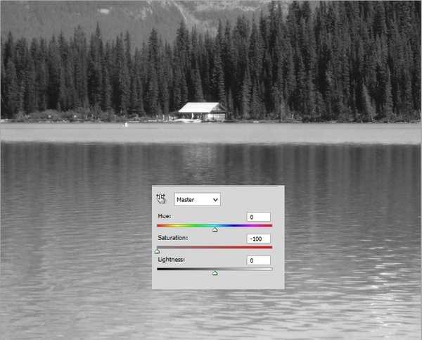 为湖景图层添加色相/饱和度调整图层,改变纹理颜色。选择"图层>新建调整图层>色相/饱和度",先调出色相/饱和度设置面板。