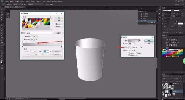 8、在渐变属性调整窗口,将渐变的角度调整为180°左右,这样就可以将渐变的方向改为竖直方向的渐变,这样就可以表现出纸杯的一定的深度。