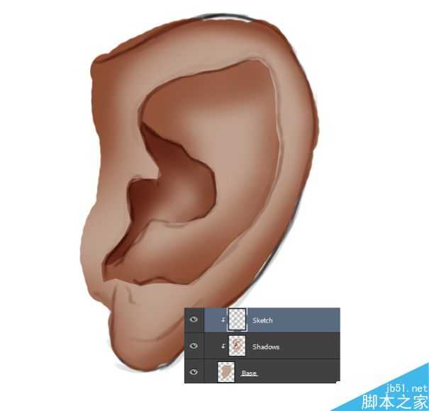 第二步:选用硬质圆头笔刷绘制草图。你们可以按照自己的喜好,形状画得更为简单些,但要尽量符合正常的人耳特征。