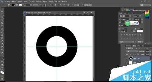 2、拉出两个相交的参考线,两条参考线相交的点做为圆心的位置,然后选择椭圆工具,按住Ctrl+shift,从确定的圆心位置开始画出一个正圆。可以将画出的正圆的颜色改成任意颜色,此处改成黑色。如下图