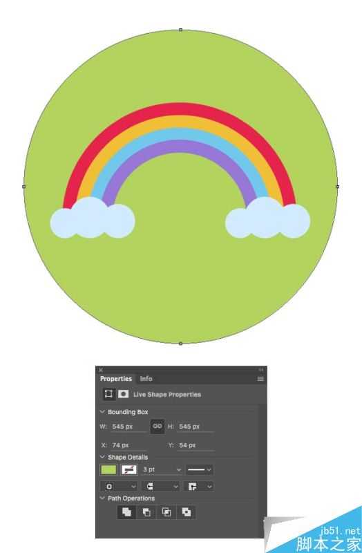 让我们在彩虹的两端弄两朵云。 使用椭圆工具(U)在彩虹的左下角画一个蓝色的小圆。 再添加几个的不同尺寸小圆。 按住(Control+G)把组成云彩的各个元素放到一组,并(Control+J)复制一组云。 放复制后的云朵放在彩虹的另一侧。