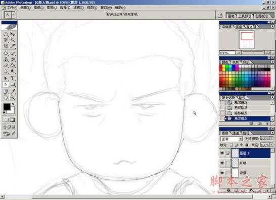 三、用钢笔工具按照草稿描出路径,并调节锚点使路径流畅。(为什么要用路径呢,好处是画出的线条很流畅,不过缺点是太费时间了,所以功底好的朋友可以用画笔直接画)。