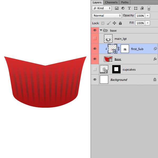 10、在条纹层上面新建一个图层,按Ctrl + Alt + G 创建剪贴蒙版,用钢笔工具在条纹的中间勾出暗部选区,填充暗红色,混合模式改为“正片叠底”。选择菜单:滤镜 > 模糊 > 高斯模糊,数值为0.6。添加图层蒙版,用黑色画笔把底部过渡涂出来。