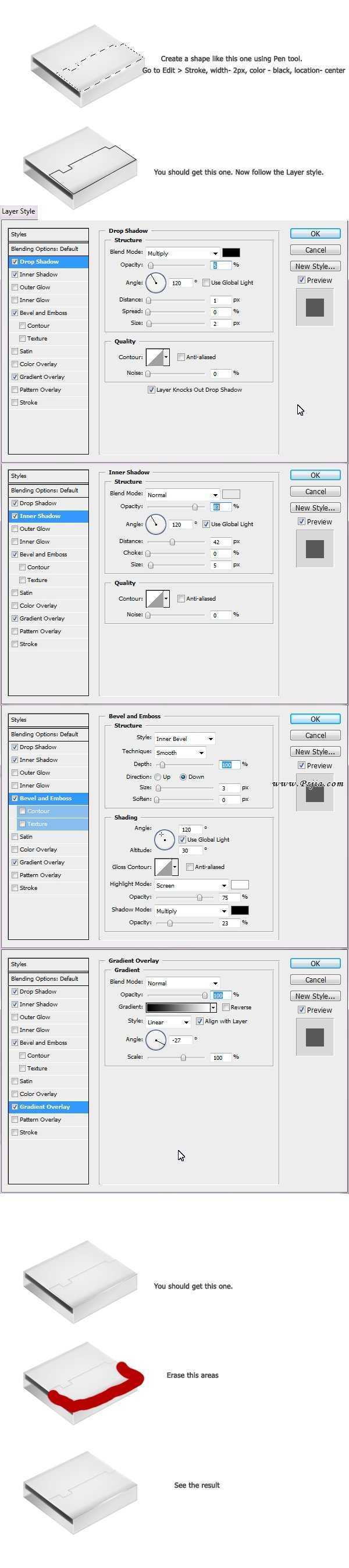 再次钢笔工具绘制一个形状像下面这样的。然后应用下面的图层样式。