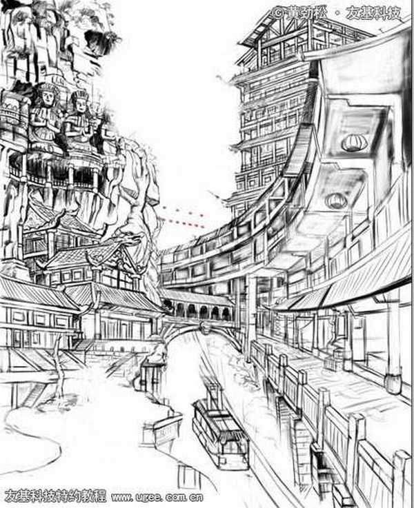 在起线稿图时,插画的透视是非常重要的,特别是这种场景画,在这里采用一点透视来进行构图,一般我把握不准的地方我会用3D软件来进行透视模拟,那样才能更准确的表现关系。然后直接在PS画布里勾勒线条,不过根据情况而言,有些朋友喜欢在纸上用铅笔把线稿仔细勾勒好了,再扫描到电脑里用PS上色。