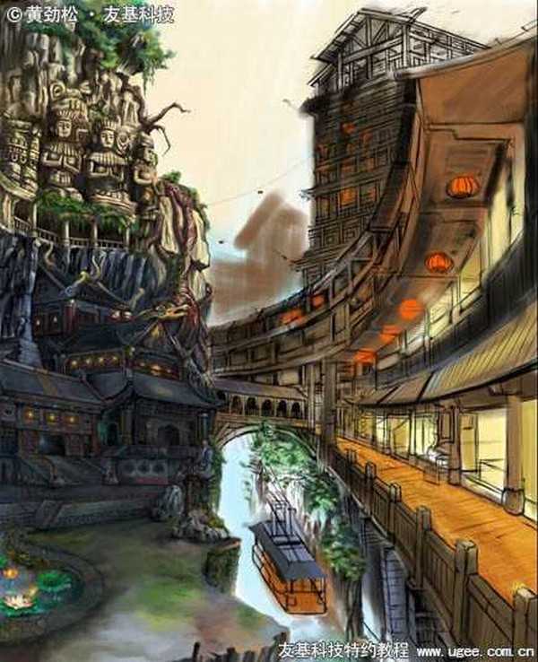 第二步就是运用素描关系在固有色基础上进行明暗划分,还是不用去管细节上的色彩。当把这种大关系主次物体表现出来后,接下来就开始细节刻画了。这里要注意的是两边近处的房屋要细画 中景远景就虚化掉。