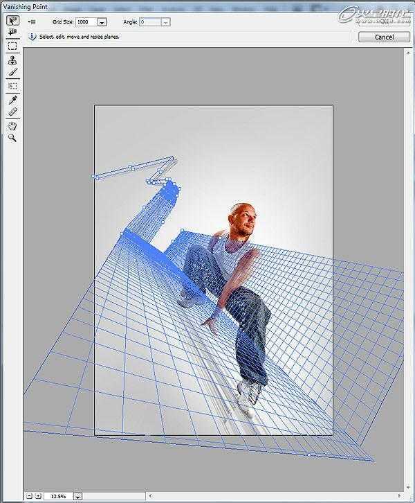现在,制作开始变得有趣了。为了能够复制出所有的消失平面,也为了保持正确的透视关系,我使用了消失点滤镜来观察人物所骑乘的平面。在这一步上我们需要充分的考虑,因为你没有参照物来确定这个平面在现实中究竟是怎样的。经过几次尝试后,我如下图那样做了设置,觉得这应该可行。做这一步设置,要执行 滤镜>消失点 。(图23)