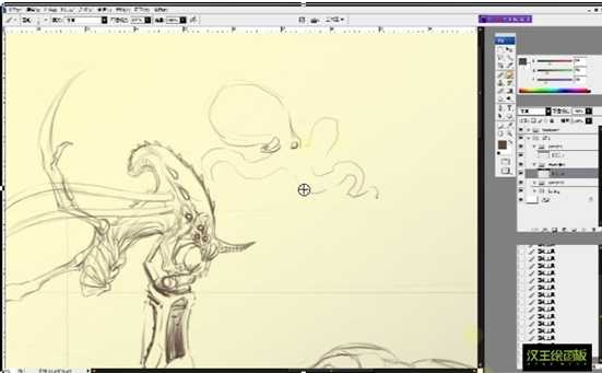 小贴士:在进行人物造型的过程中,要使用复杂的线条来构建人物形象,因而对数位板的压感和读取速度的要求较高,建议选择读取速度以上、坐标精度较高的数位板产品,这样在绘制过程中可以保持线条绘制的准确率和速度。本作品是使用汉王创艺大师三代数位板产品完成,该产品在压感表现和读取速度上都有很好的表现首先,在ps图层面板分三个集,以前景,中景,远景(背景)予以划分在中景中以直线定下大致格局,然后以色块铺就地面轮廓