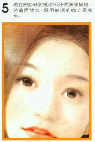 5、现在开始针对眼球部分做细节描绘,将画面放大,选用较深的咖啡黑着色。