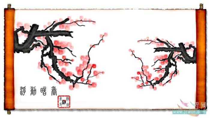 梅花的枝条表面具有很大的不规则性,所以不能直接使用默认画笔样式来绘制,应使用具有这种特性的画笔样式来绘制,另外,水墨画边缘上应用湿边效果,在绘制过程中应设置画笔具有湿边属性。
