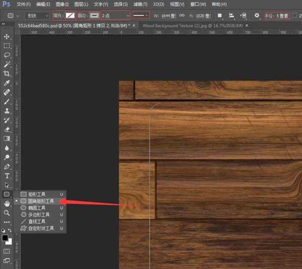 2、用PS打开背景素材,直接在背景素材上做玻璃质感,选用矩形工具中的圆角矩形,在参数设置栏,设置角度随意,不要太小即可这里选择5,不填充,描边2点,实线,颜色如图选择67%的灰色。