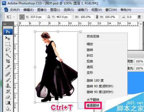 3、接下来按Ctrl+T快捷键调出自由变换工具,在其上右键单击选择垂直翻转,然后按回车确定。