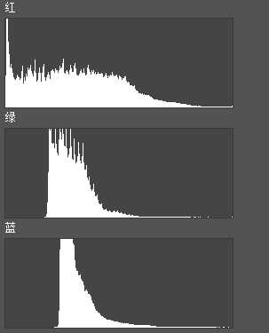 因此,绿色通道直方图没有分布在0-43这个亮度区间,不是说在一张照片中的阴影部分中,绿色分量为0!这一点千万不能混淆!这是因为所有像素中没有任何一个像素中的绿色分量的数值在0-43之间,所以说就表现为这样的通道直方图形态!
