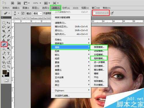 14、人脸美白,去皱等。这也是新手玩ps的目的之一,有人就想问了为什么不去直接下个美图秀秀一键美白呢?因为用美图秀秀别人一下就能看出来你修过,用ps,即使是我这个菜鸟,也可以做到让别人看不出来。也有人说,我都学会了仿制,可以祛痘啊,那我只能告诉你自然美和修图美的区别了!废话不多说,先说要用到哪些工具1.选区工具2.橡皮擦(勾选抹到历史纪录)3.滤镜-模糊-高斯模糊。具体在哪呢?如下图,在选中橡皮擦的状态下上一栏靠右边有个抹到历史纪录的选项,如何能勾选我一会说,绿框框中的就是滤镜了,表面模糊和高斯模糊的效果有些类似,一会用哪个都可以。