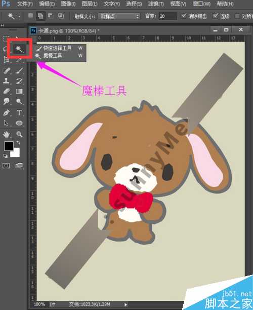 3、现在我们就来用魔棒工具抠图。选择工具箱中的魔棒工具,我们将容差设置小一点,夏夏在这里就将容差设置为20,然后勾选消除锯齿,勾选连续。容差就是允许的颜色范围,我们设置的容差越小,选择的也就越精确;同理,如果我们的容差设置的越大,选择的也就范围越广。