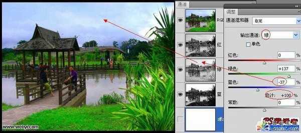 看上图16,这时绿色通道里的天空、水面也随之增亮了许多,这是我们不希望的。要想办法降低天空、水面的亮度,恢复到原来水平。再对比红通道、蓝通道,在蓝通道里,天空、水面的亮度最亮,作为选区,它是最好的。这时的输出通道是绿,故将蓝色百分比的小滑块向左滑动,就等于是以“蓝色通道作为选区”,在绿通道中降低这部分选区的亮度。所以,一边看绿色通道中天空、水面的亮度降低,一边将蓝色百分比的小滑块向左滑动,直到绿色通道中天空、水面的的亮度,恢复到原来水平时止(这时合计为100%时,绿通道的中性灰颜色保持不变)。效果见图17。