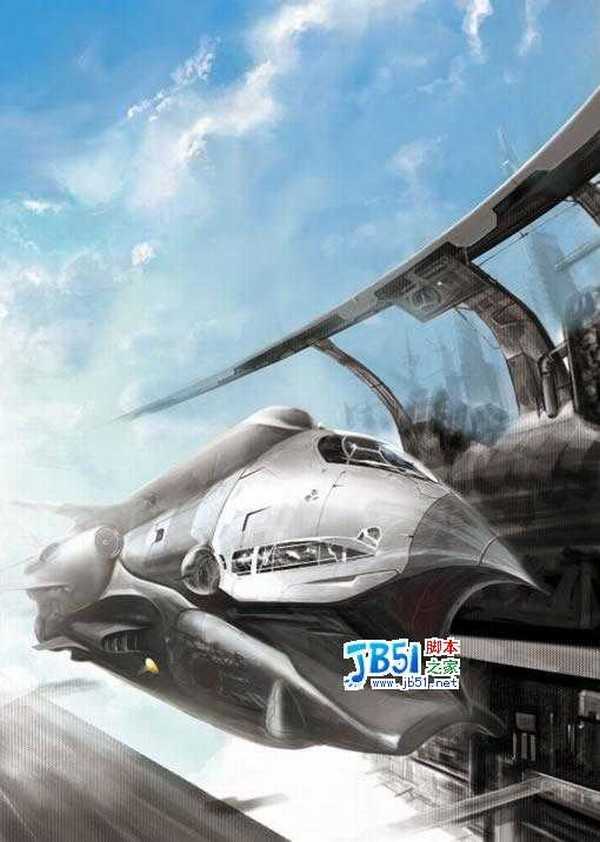 2、把背景具体化。并且调整飞船的亮度,让整体统一。有些部分是将画笔的纹理选项打开,添加合适的材质。