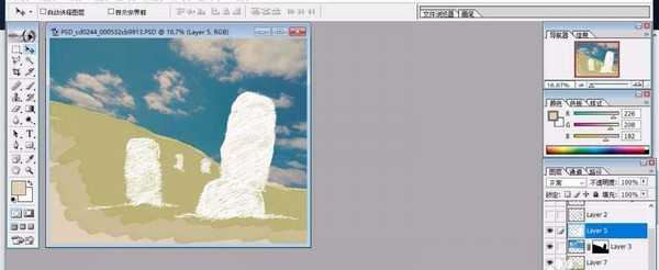 1、先用土黄色填充这个背景,再置入一个蓝天与白云的图片,我们设置成正片叠底的效果。
