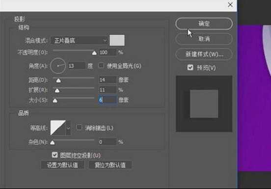 4、选择【椭圆形状图层】,【右击】图层-【混合选项】-【投影】,具体参数如图示。具体效果如图示。