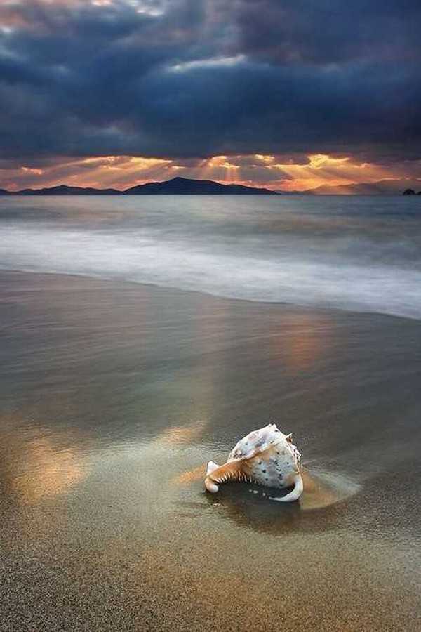这时候大家的第一视觉落脚点应该在画面下部的海螺,但不仅限于此,你还会观察到远方的霞光,实际上,你在欣赏这张照片的时候,你分了两个步骤,拥有两个层次,而摄影师可以通过他的构图来影响你的观测顺序和观测层次,这就是所谓的构图能主动引导观者。