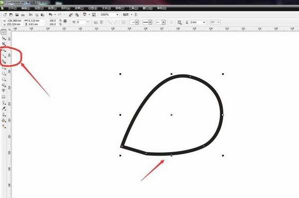 在工具栏中选择贝塞尔工具,绘制曲线,类似花瓣的效果,如下图所指示,一定要将图形完全闭合,不然不能填充颜色,也开始使用属性栏闭合曲线