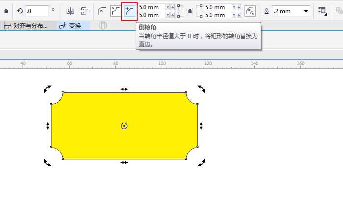 7、我们也可以把矩形的角换成倒棱角,点击上面的"倒棱角"按钮,如图所示;