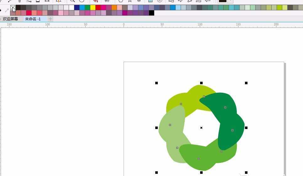 4、填充颜色,两个花瓣一个颜色。分别填充:①#A1CB76浅绿色②#A9CB05草绿色③#028A44墨绿色④#61B431;全选,鼠标右键××,去掉轮廓色。