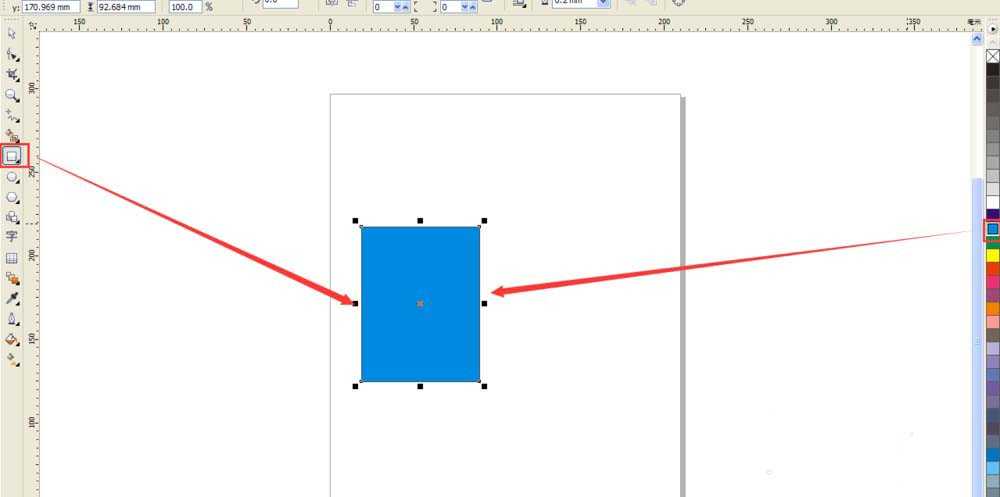 1、打开CorelDRAW软件,选择矩形工具,绘制一个矩形,然后在右边,用鼠标左键选择一种颜色,进行填充。