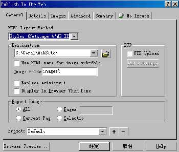 还有很多方法,可以做到这里介绍到的功能:例如,您可以在File菜单下执行Publish to the web/HTML命令,调了Publish to web对话框,进行输出设置;或者,执行View下Enable Rollover命令,进行初步预览;同时,在CorelDRAW10的右键菜单下,也提供了这些相应的设置。