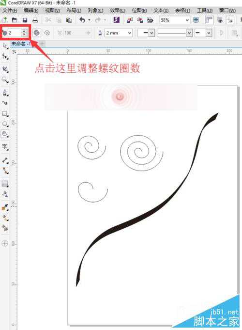 4、选择工具箱中的螺纹工具,在属性栏中设置螺纹圈数,分别设置为1 .2 .3 ,画出3条螺纹出来。我们可以选择工具箱中的形状工具,点击节点将其调整一下,太规则的话,看起来不是很自然。