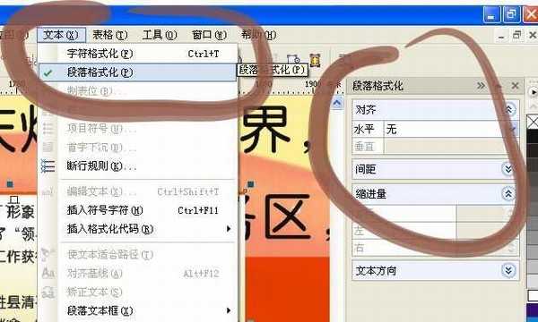 CDR中,按F8,再在需要打文字的地方按住鼠标左键拖一个文本框,现在大家看到,文字很乱,------------------------呵呵,开始调整了:首先,CDR菜单中点机 文本-----段落格式化,弹出段落菜单