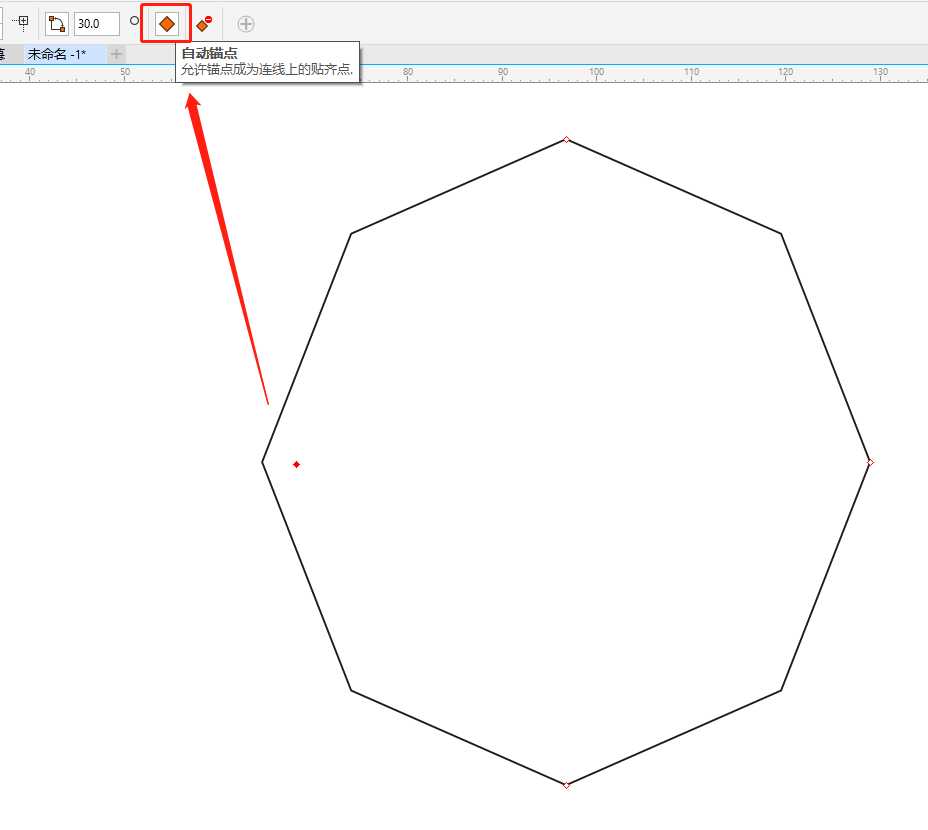 4、点击属性栏上的【自动锚点】允许锚点成为连线上的贴齐点,一般是默认激活的,也就是红色锚点,当自动锚点关闭时,锚点变为蓝色。