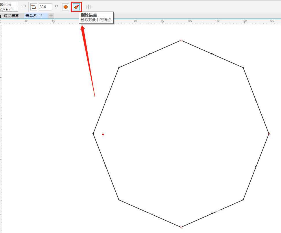5、点击属性栏上【删除锚点】可以删除选择的锚点。