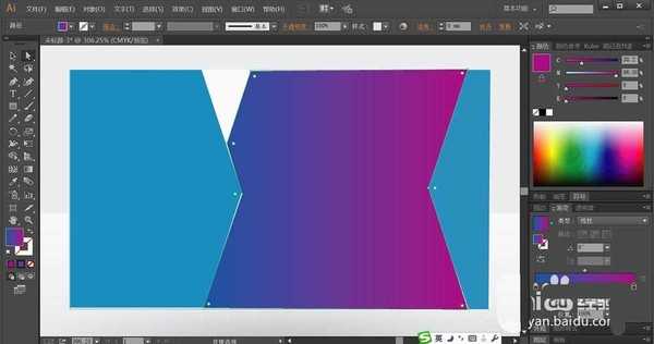 6、接着,我们再用矩形画出名片的背面路径,使用钢笔描绘出名片背面的细长尖角路径。我们用蓝紫色到紫红色的渐变填充,再用反向渐变填充名片的右侧尖角。