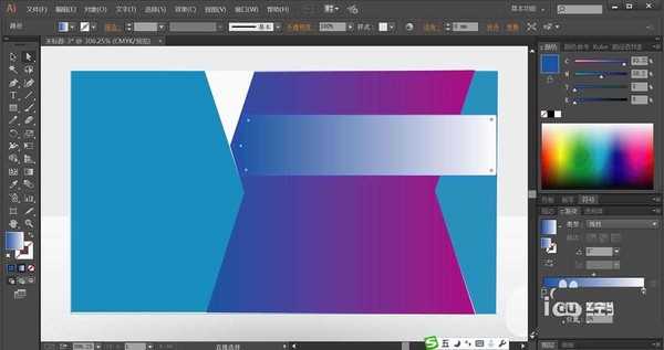 4、设置蓝紫色到紫红色的渐变填充名片的中间结构路径,再用矩形画出名称所在的矩形轨迹,我们用蓝白色的渐变填充。