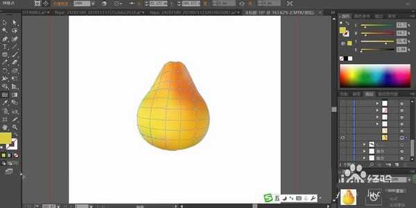 1、先用钢笔画出梨子的基本轮廓,我们用中黄色填充,再用网格工具分解出不同的色彩区域。