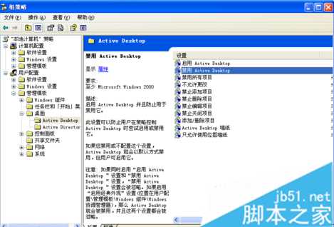 2、在左侧展开用户配置--管理模板--桌面--Active Desktop,双击右侧的“启用Active Desktop”;