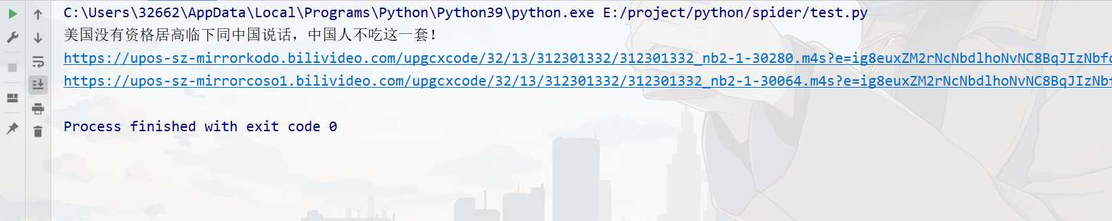 import requestsimport reimport jsonimport pprintheaders = {"user-agent": "Mozilla/5.0 (Windows NT 10.0; Win64; x64) AppleWebKit/537.36 (KHTML, like Gecko) Chrome/89.0.4389.90 Safari/537.36","referer": "https://message.bilibili.com/"}def send_request(url): response = requests.get(url=url, headers=headers) return responsedef get_video_data(html_data): title = re.findall('<title data-vue-meta="true">(.*?)</title>',html_data)[0].replace("_???????? (?b-?b)???? ????~-bilibili","") json_data = re.findall(r'<script>window.__playinfo__=(.*?)</script>',html_data)[0] json_data = json.loads(json_data) #pprint.pprint(json_data) audio_url = json_data["data"]["dash"]["audio"][0]["backupUrl"][0] video_url = json_data["data"]["dash"]["video"][0]["backupUrl"][0] video_data = [title, audio_url, video_url] return video_datahtml_data = send_request("https://www.bilibili.com/video/BV1Qy4y147H1").textvideo_data = get_video_data(html_data)for item in video_data: print(item)