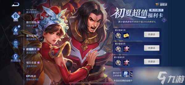 《王者荣耀》超值福利卡活动入口在活动面板-【超值周卡】激活送好礼,活动内部分奖励需要累计登录游戏天数后才能领取,活动时间从5月11日开始,至5月17日结束,奖励领取时间到5月21日。