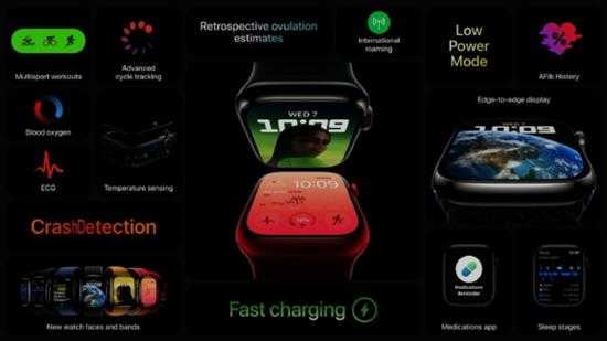 Apple Watch Series 8公开,将于9月16日推出,GPS 版售价399美元,蜂窝版本售价499美元。采用大屏窄边框设计,防水防尘抗裂,这款产品将通过全新的温度传感器让女性用户了解自己的经期与排卵期等隐私信息,还将通过新的加速感应器来预防各种车祸情况。 新增的“低功耗模式”能够允许充满电后,最高续航达到36小时。
